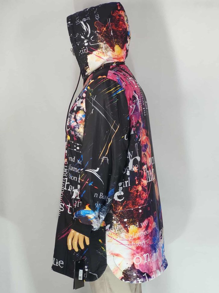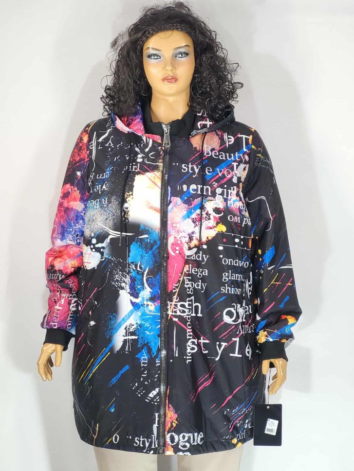 Дамско макси средно дебело яке в големи размери с подвижна качулка и интересна щампа 06 00271