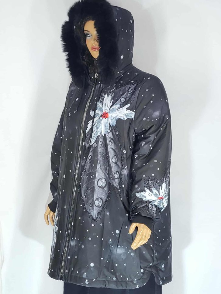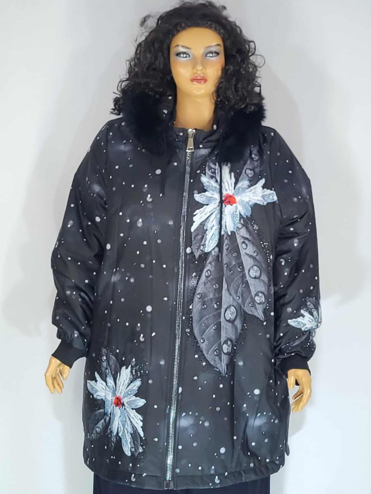 Дамско макси зимно яке в големи размери с интересна щампа цвете и камъчета със сваляща се качулка 06 00273