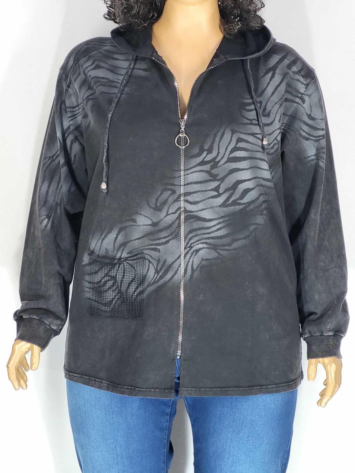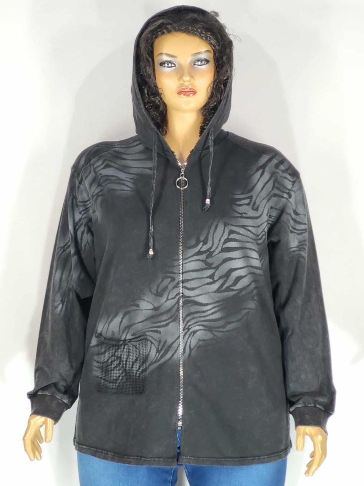 Дамски макси суичър варен памук в големи размери с цип и интересна щампа в тъмно сиво 08 00057