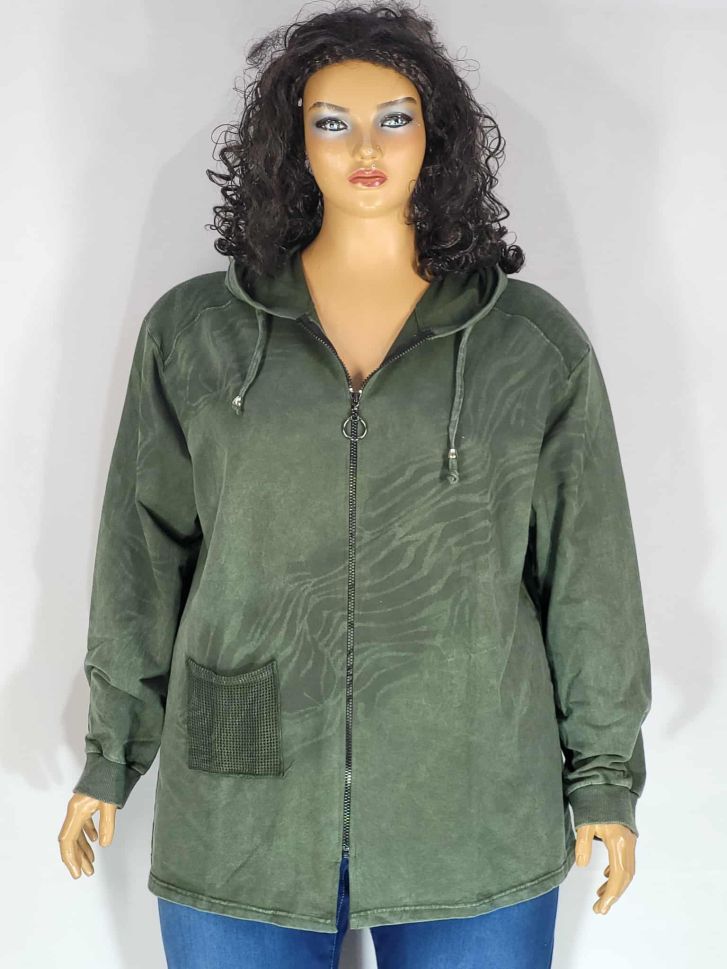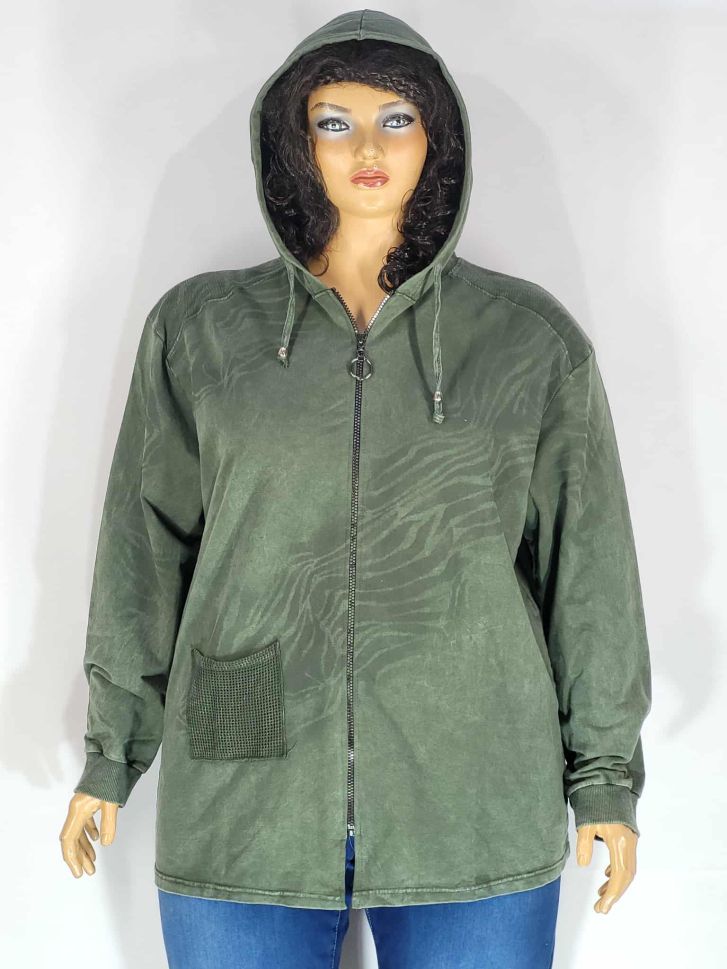 Дамски макси суичър варен памук в големи размери с цип и интересна щампа в маслено зелено 08 00058