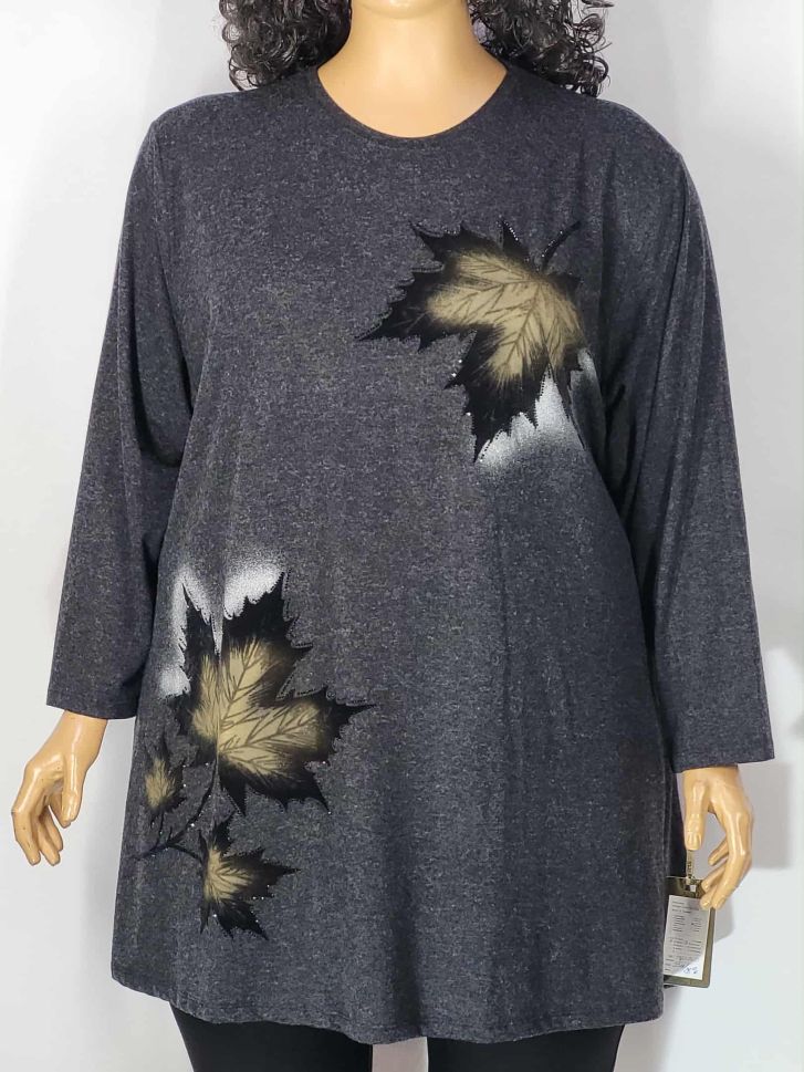 Дамски макси разкроен блузон в големи размери с щампа и камъчета от кашмирено трико в сиво 01 01521